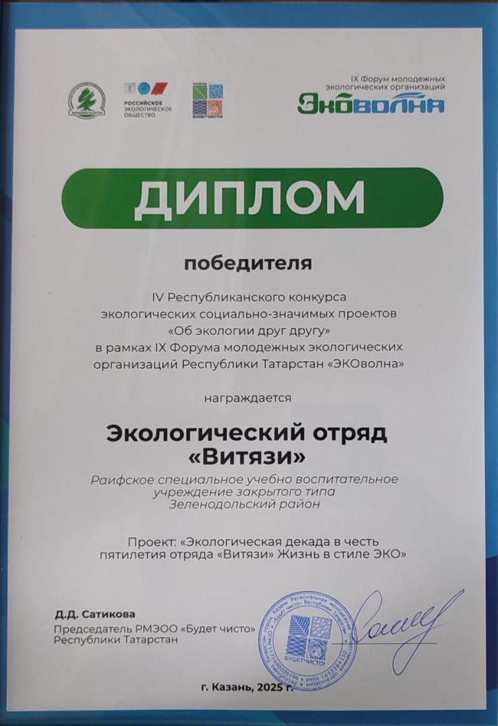 Победителем конкурса стал проект «Жизнь в стиле Эко» экологического отряда «Витязи» Раифского СУВУ Зеленодольского района.