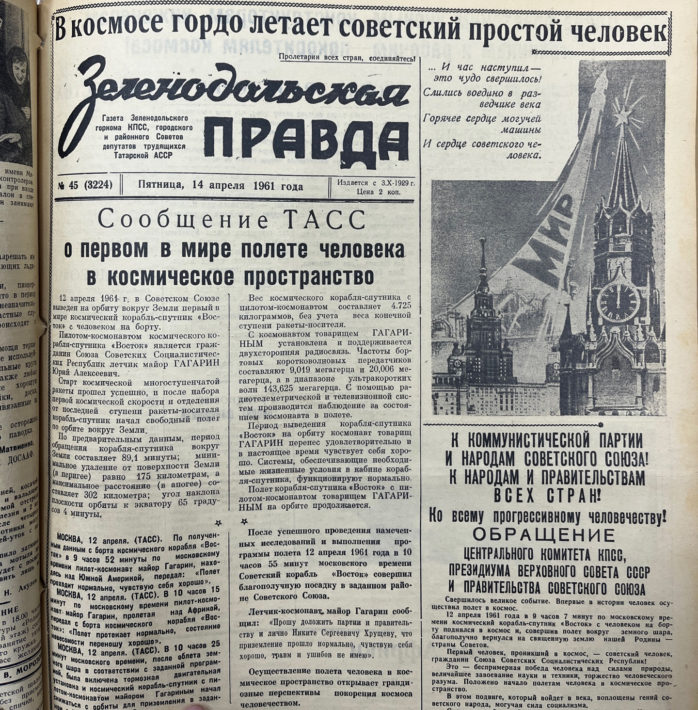 Журналисты на местах ловили каждое слово, каждую эмоцию. «Зеленодольская правда» 14 апреля вышла с удивительным по своей искренности заголовком: «В космосе гордо летает советский простой человек». На первой полосе — официальное сообщение ТАСС, тёплое обращение к Юрию Гагарину Никиты Хрущёва. А вторая страница уже буквально пульсировала от эмоций. Это был живой голос зеленодольцев: фанерщиков, швей, строителей, сельчан. «Восхищён! Трудно выразить свои чувства, счастливого возвращения, товарищ майор!», «Мы гордимся вами, дорогой Юрий Алексеевич! На ваш полёт ответим новыми трудовыми успехами!»