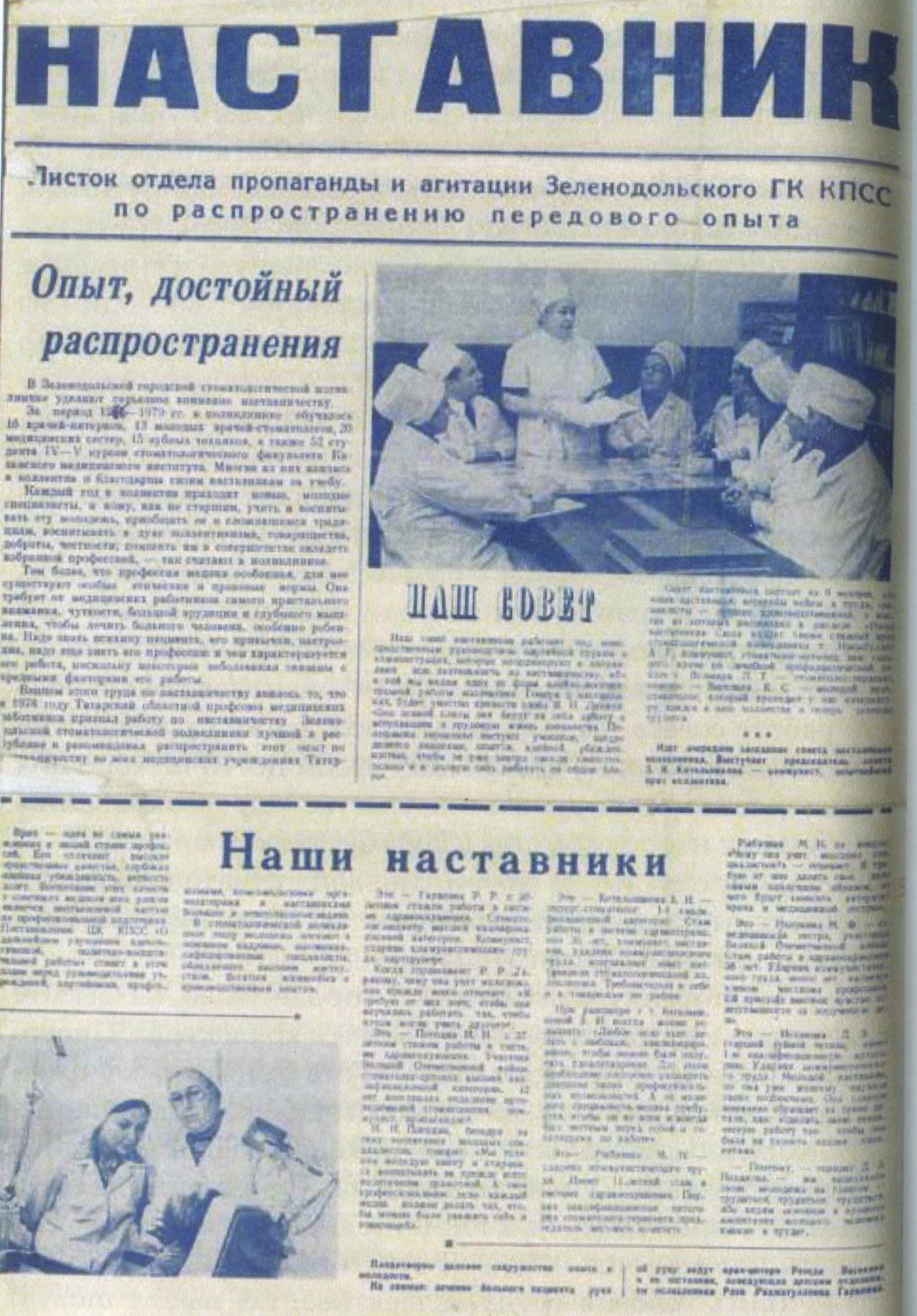 Так укомплектовали в течение 6 лет свою зуботехническую лабораторию зубными техниками и готовили специалистов для республики. В 1976 году мы организовали совет наставников, а 1978 году признал Татарский областной совет профсоюзов медицинских работников лучшим советом наставников Зеленодольской городской стоматологической поликлиники в республике и рекомендовал распространить наш опыт работы по наставничеству на все медицинские учреждения республики. Больше ничего не предпринял обком профсоюзов по распространению опыта по наставничеству. Главный врач Зеленодольской ЦРБ создал совет наставников ЦРБ из лучших и заслуженных врачей города, председателем совета наставников ЦРБ избрали председателя совета наставников стоматологической поликлиники.