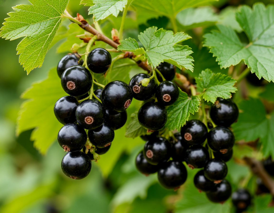 У чёрной смородины ягоды появляются на боковых веточках по всей длине