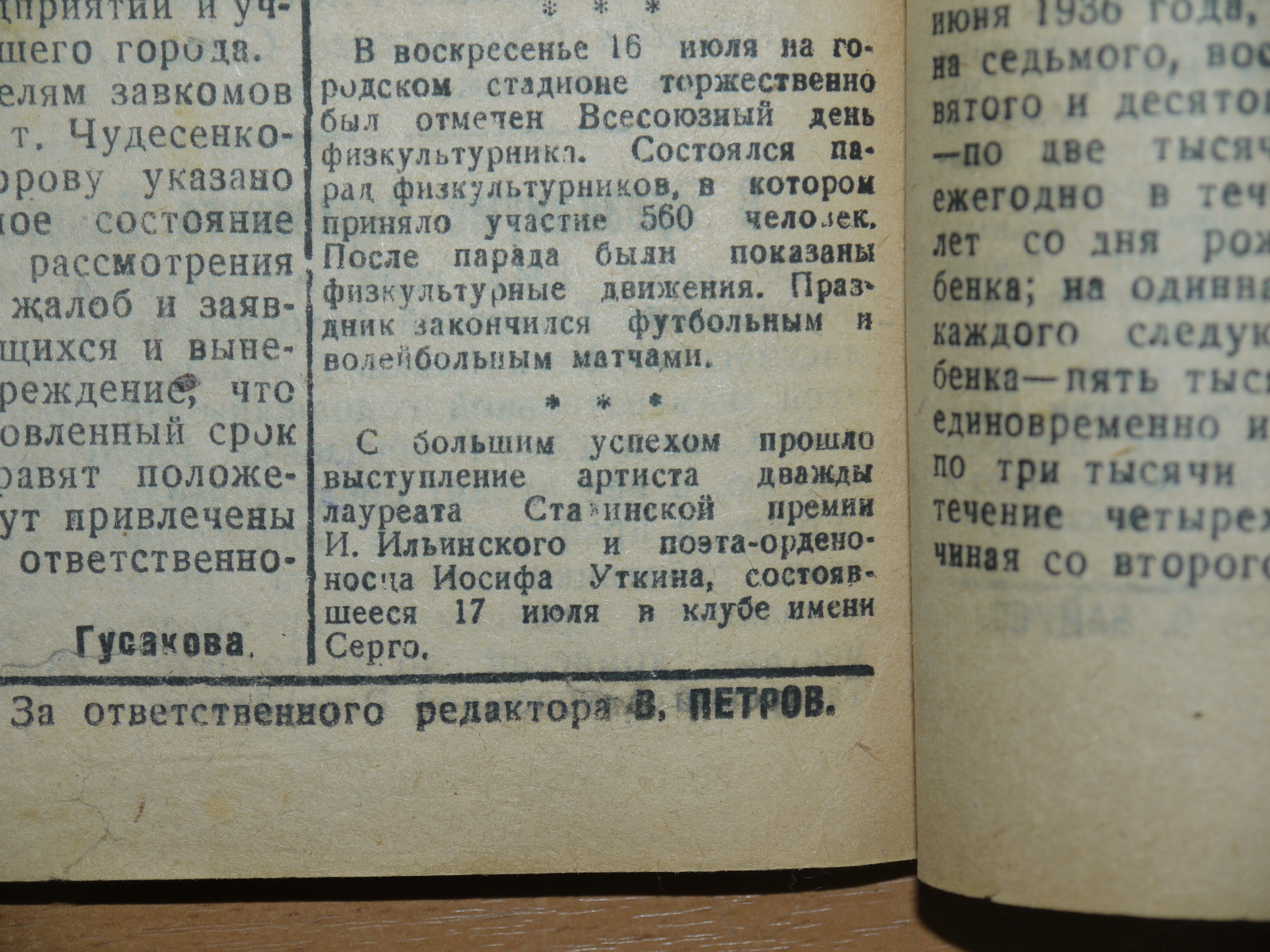 «С большим успехом прошло выступление артиста, дважды лауреата Сталинской премии И. Ильинского и поэта-орденоносца Иосифа Уткина, состоявшееся 17 июля в клубе имени Серго».